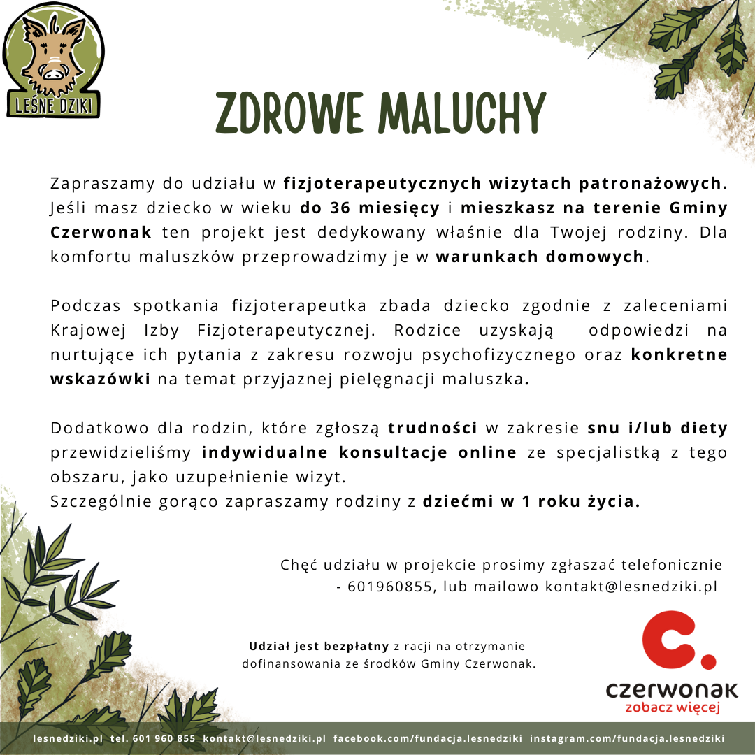 Zapraszamy do udziału w fizjoterapeutycznych wizytach patronażowych. Jeśli masz dziecko w wieku do 36 miesięcy i mieszkasz na terenie Gminy Czerwonak ten projekt jest dedykowany właśnie dla Twojej rodziny.