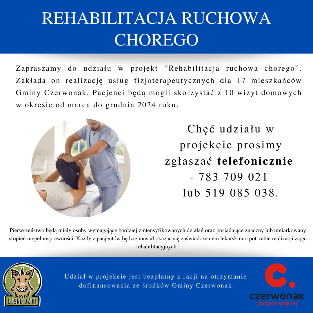 Zapraszamy do udziału w projekt “Rehabilitacja ruchowa chorego”. Zakłada on realizację usług fizjoterapeutycznych dla 17 mieszkańców Gminy Czerwonak. Pacjenci będą mogli skorzystać z 10 wizyt domowych w okresie od marca do grudnia 2024 roku.